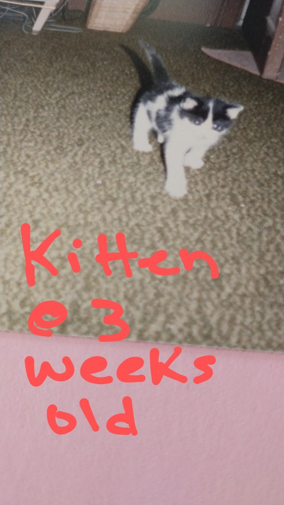 The kitten in the photo above was an orphan that I took in many years ago when it was about 10 days old. It was after it was presumed that a dog killed the mom & the rest of the litter. My boyfriend at the time lived with the dog’s owner & they found this kitten alone in the garage or shed on the property. My sister Karen & I shared the responsibility of hand feeding the kitten. She didn’t have any siblings & our cats at the time all hated the kitten, so we didn’t let them interact with her. As she grew she was a biter & her teeth were very sharp. She loved to play, so we would redirect her from biting with toys or time outs, meaning we ended the play time to let her figure out that if she bit the play ended, like her siblings would have done had she had any at that time.