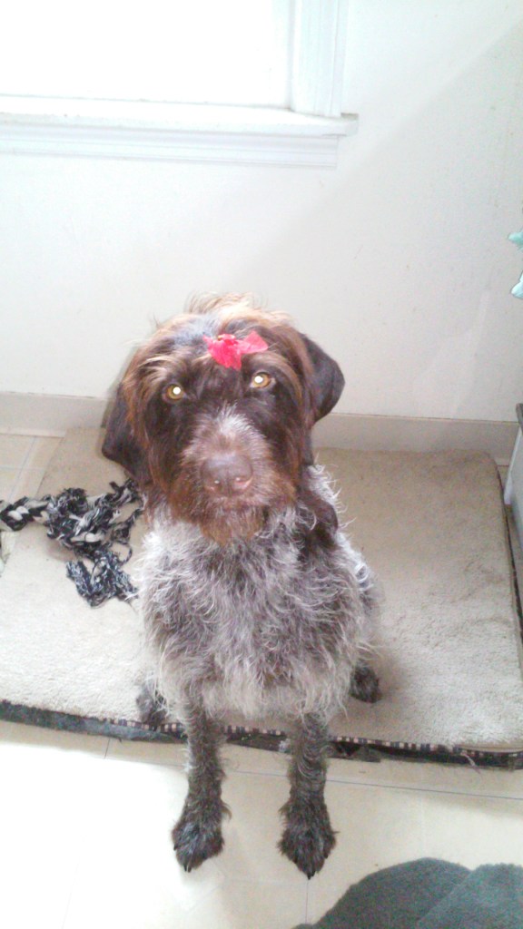 I have hinted that something tragic had happened with my previous dog Sydney. I felt it was time to share her story. I need to start with some background about her first. A friend of the head of the rescue I was with had a brother in law who raised hunting dogs & he was taking some pups in to his Veterinarian in Nov 2014. His Vet said to him I have a Wirehaired German Shorthaired Pointer that needs a home. He knew that Jonathan had placed hunting breed dogs before. So he went back & saw the dog & said “no the breed you have a Wire-haired Pointing Griffon” & what’s the situation. Sydney (not her name then) had been brought in my her owner to be euthanized & the Vet asked why, she was almost 3 & healthy. He said she went after him, the Vet & staff were shocked (plus there wasn’t a visible mark on him), because she was a very submissive/scared dog, they had seen her since she was a pup. They pushed him a little & he admitted to kicking her, pulling her off things & more. They convinced him to surrender her. Jonathan took her home & she was so scared & even soiled a chair when a male stranger came to the house. A few weeks later I was asked by the rescue president if I knew anyone who would want to foster her. I said I would, I had always been good with fearful dogs & wanted to help her. I was not expecting to adopt her. Dec 1st 2014 she was brought to my home & she wouldn’t hardly even look at me. She was scared of so many things & no question in my mind she was abused & needed time & patience.