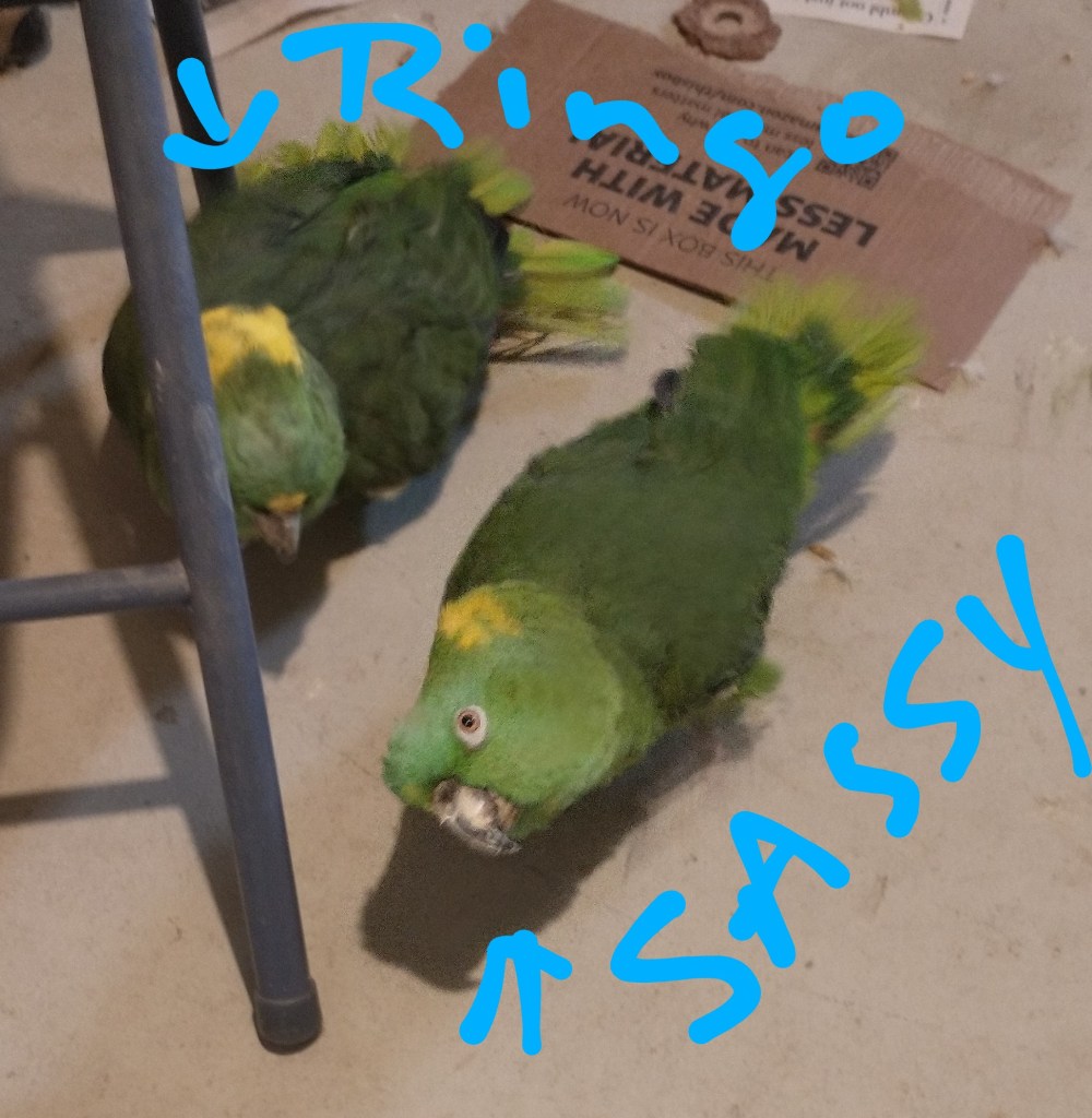 Ringo & Sassy are Yellow-Nape Amazons & that is probably my favorite of the Amazons. I have had a Blue front Amazon, A Mealy Amazon & A Double Yellow-Headed Amazon. I have had males & females & I don’t have a preference, but my experience is that females are more mellow, less aggressive when wild caught or not tame. Both Ringo & Sassy are no tame but still pretty active for senior birds & enjoy chewing & being out of their cages & hanging out together. It turned out they really like to be together, I think Sassy seeks it more, but Ringo is totally good with it. I try & let them out for a couple hours when I will be home. They have a room they hang in to keep them safe from the dogs. Ringo tries his best to annoy my dog Echo under the door (1/2 inch gap), so there is a baby gate to keep Echo paws safe. Ringo & Sassy laugh on their side of the door as the bug Echo. Echo can easily get focused on something so sometimes I have to call Echo away & restrict his ability to get near the room. Ringo is not a big talker, he says “hi”, “What’s up” & wolf whistles. Sassy talks quite a bit more, so guessing over time Ringo may learn more words. I really don’t care, but find it interesting how different their voices are.