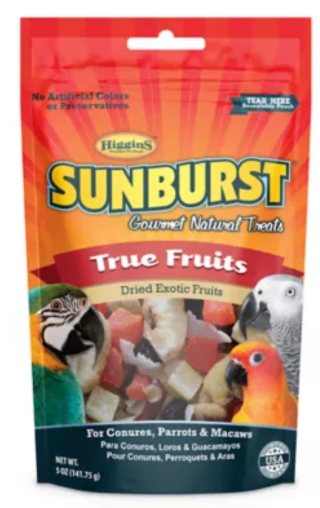 Dried fruit without sugar, salt or chemical preservatives can be a nice treat as well. Some birds will eat dried fruit like this, but not touch fresh or the opposite. I recommend you read the ingredients before buying them for your bird. Fruit is a natural sugar, so don’t feed more than about a teaspoon a couple times a week.