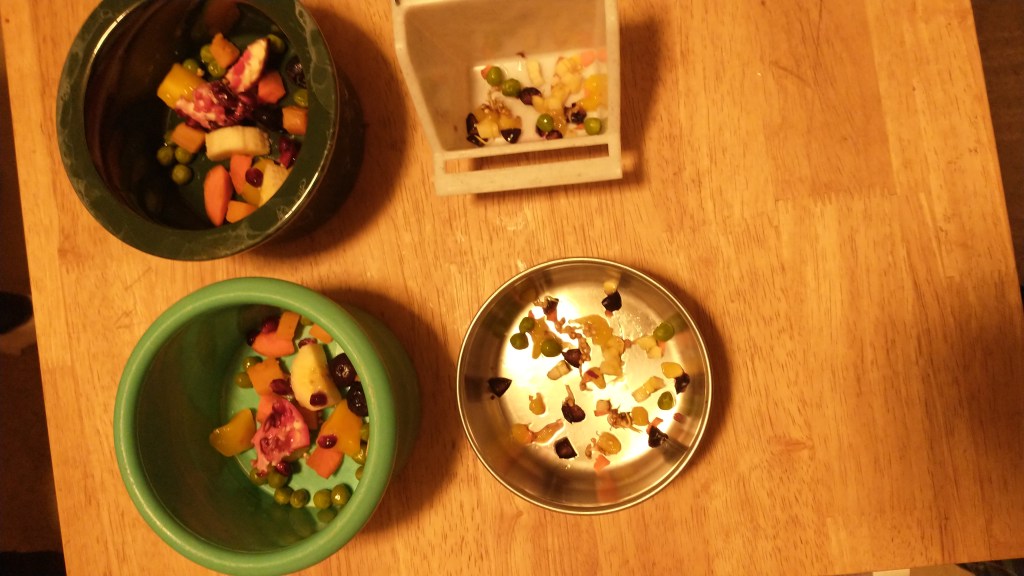 I use a tea strainer (pictured above), it has a chain so it hooks on my kitchen faucet. I put in some red & white millet seed (I buy the seeds separately & keep some in a jar in a cabinet). I put about 1/2 an inch of seed in the tea strainer & then rinse & rinse it for about a minute. I let in hang on the faucet & 1 or 2 times a day I run some water over in for 10-15 seconds. After a couple days if it is good seed it will sprout & I place a little in with my birds fresh foods. If they are birds that don’t eat fresh well then I’ll put it on top the first few times then I start to mix it in. I figure when they are digging around for seeds they will get some fresh foods on their beaks & maybe realize it tastes good. It takes patience & time to figure out exactly what your bird will eat & how they like it cut.