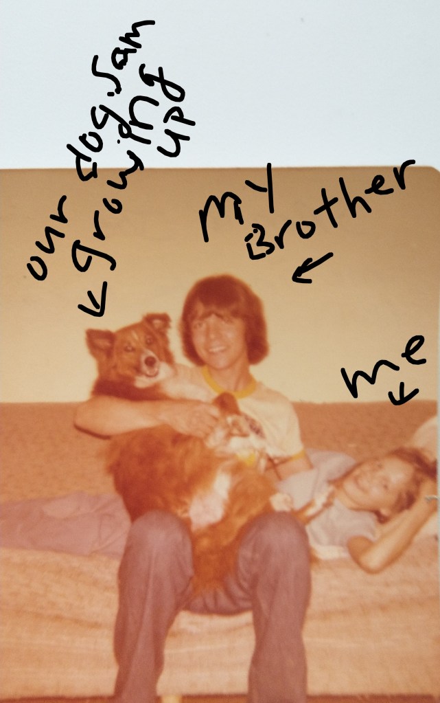 In the above photo I can see that Sam was not thrilled to be held in this matter. We were kids & our dog loved us & we loved him, plus we were clueless that he wasn’t good with this.
