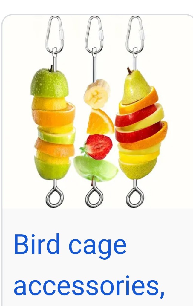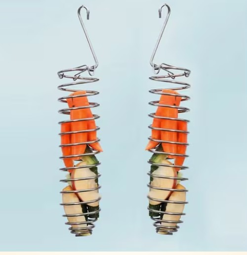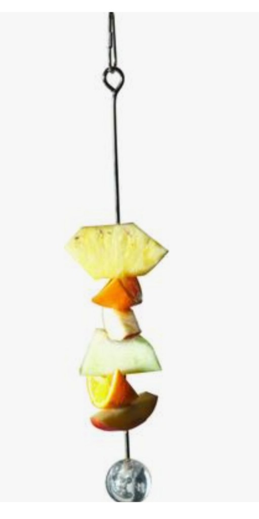 Veggie & fruit kabob skewers are another idea & they are usually used for birds that are medium to large. They come in a variety of lengths & looks, with some having a ball you unscrew & feed food onto it & then put the ball back on.