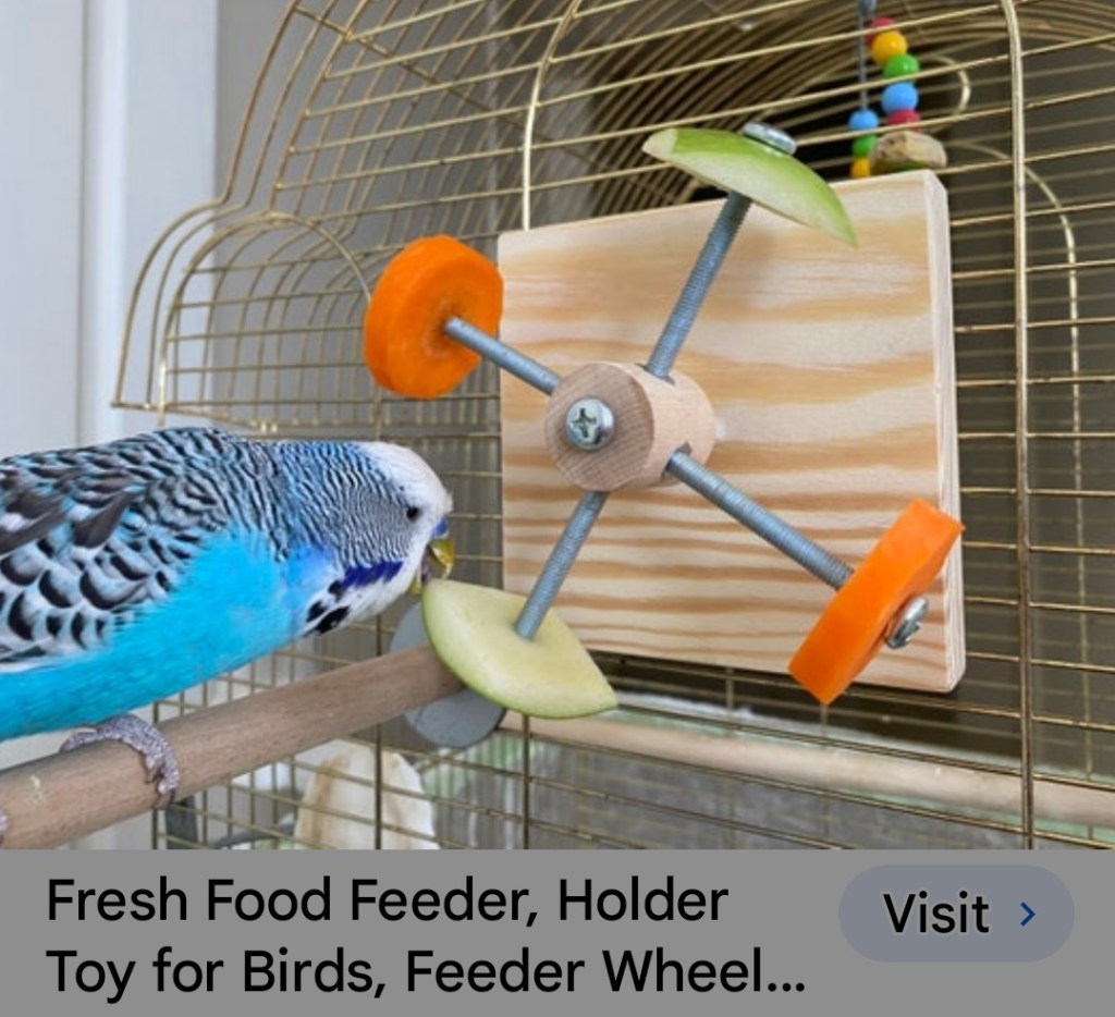 This one above allows you to attach a piece of food to a wheel & your bird can play & eat.