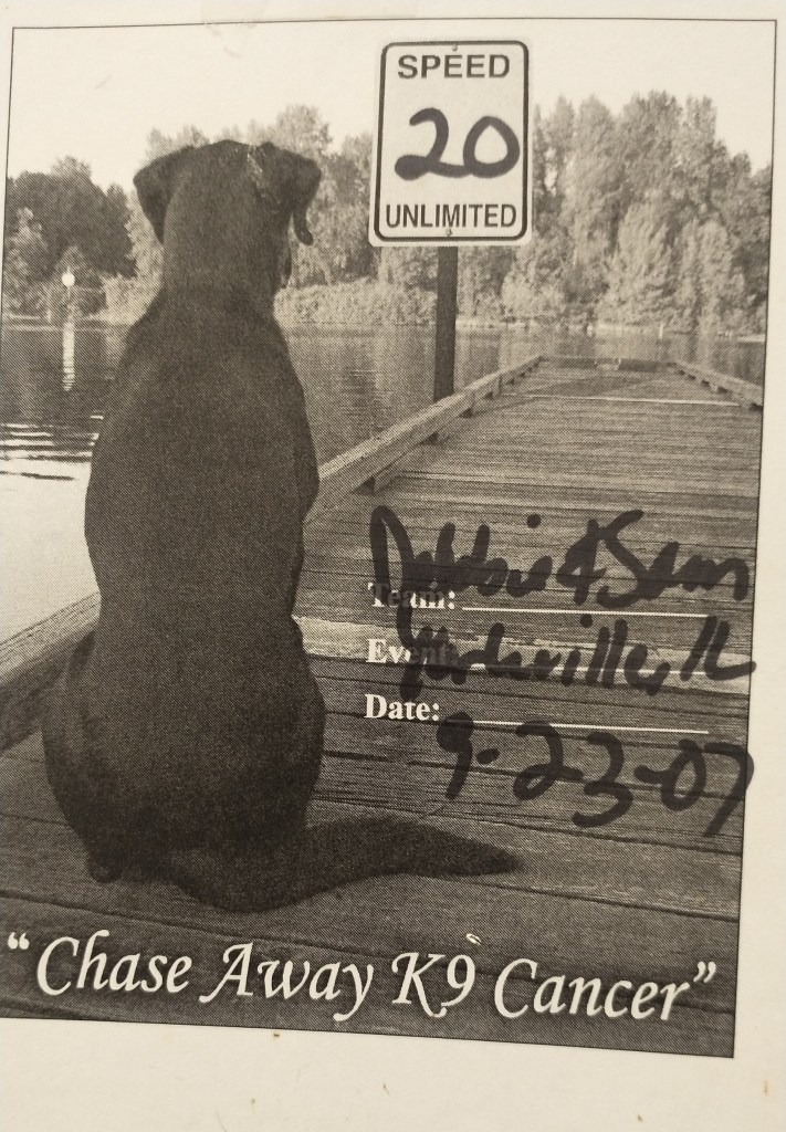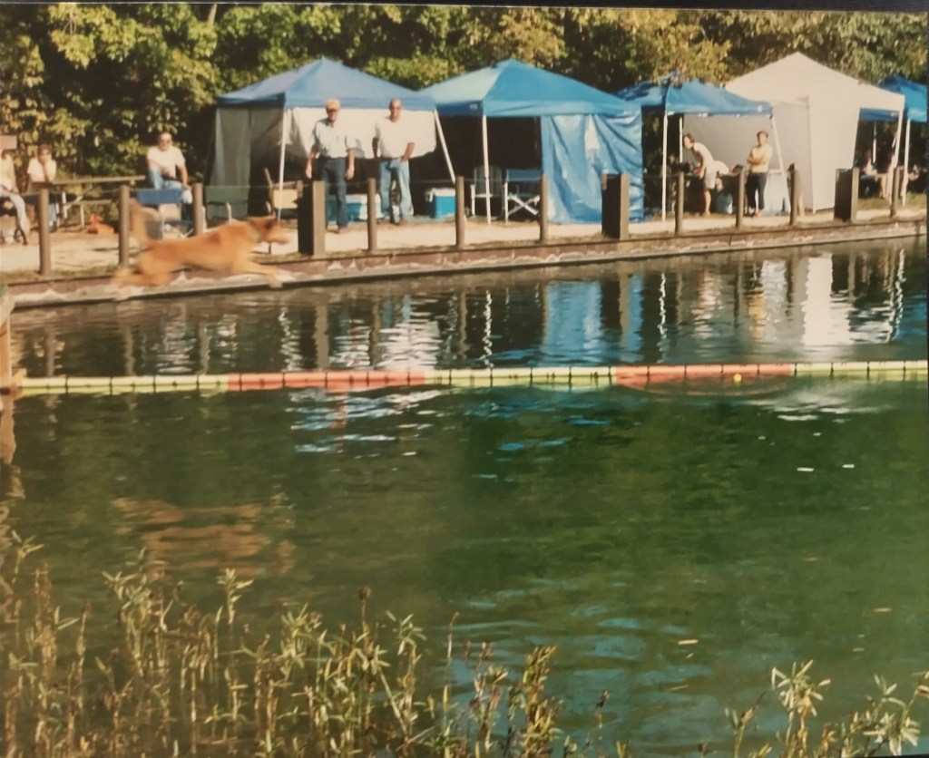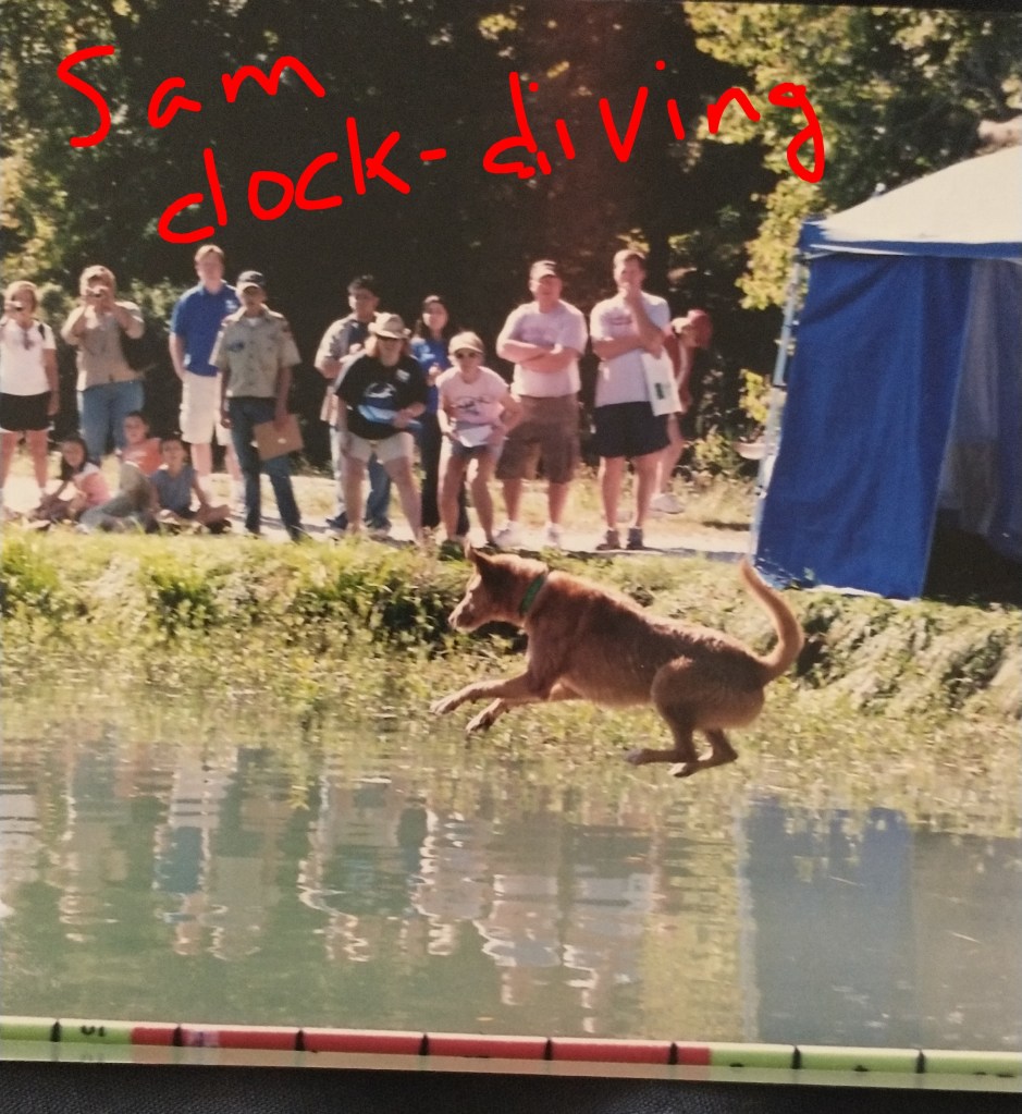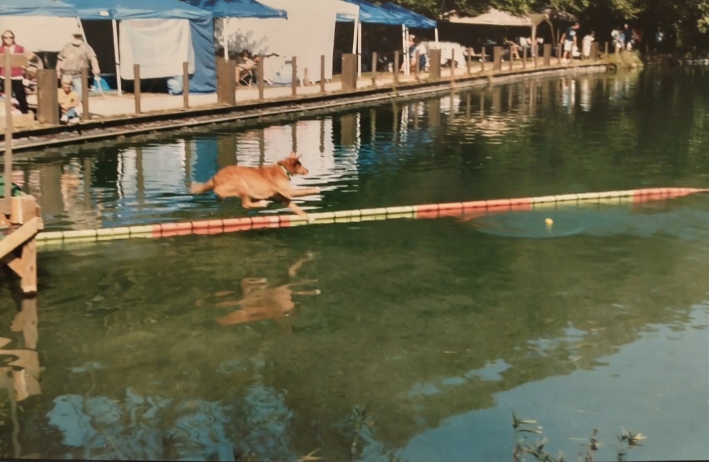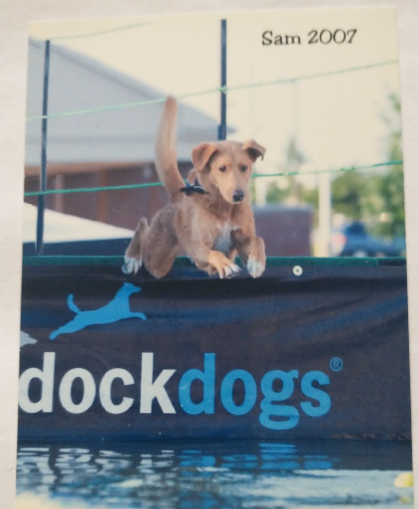 Dock diving is a sport that is fun for any water & retrieving loving dog. Many competitive dog sports are mainly for purebred dogs, but not dock diving. Pictured above is my dog Sam at a dock diving competition in 2007 when Sam was about 6 yrs old. Sam loved to play ball fetch & loved to swim, so this sport was a great match for him. I think we competed in the sport for 2-3 seasons, but honestly can’t recall exactly. We stopped after Sam had some really bad seizures & he didn’t pounce back as fast & I was concerned to be away from his Vet till we had things under control. The group I competed in also started to just host events only inside & Sam didn’t like the overhead lights reflecting on the water & he won’t jump. Sam had his novice title & was 1-2 legs into his Jr title when we stopped competing.